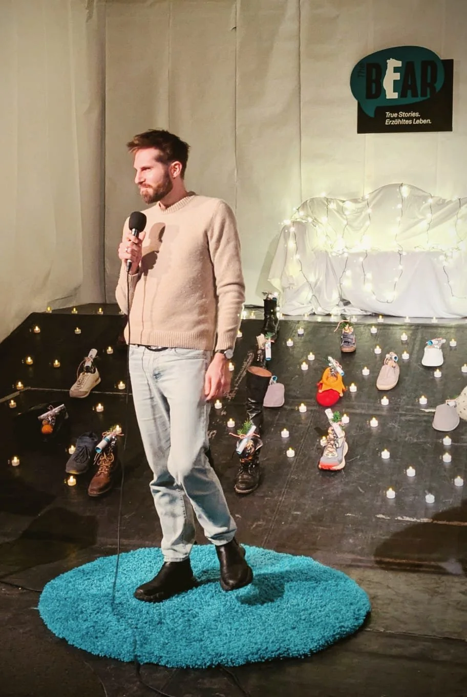 But every month, she transforms into the beating heart of THE BEAR — hosting, charming, persuading, and occasionally arm-twisting Berliners to step into the spotlight and share their stories.