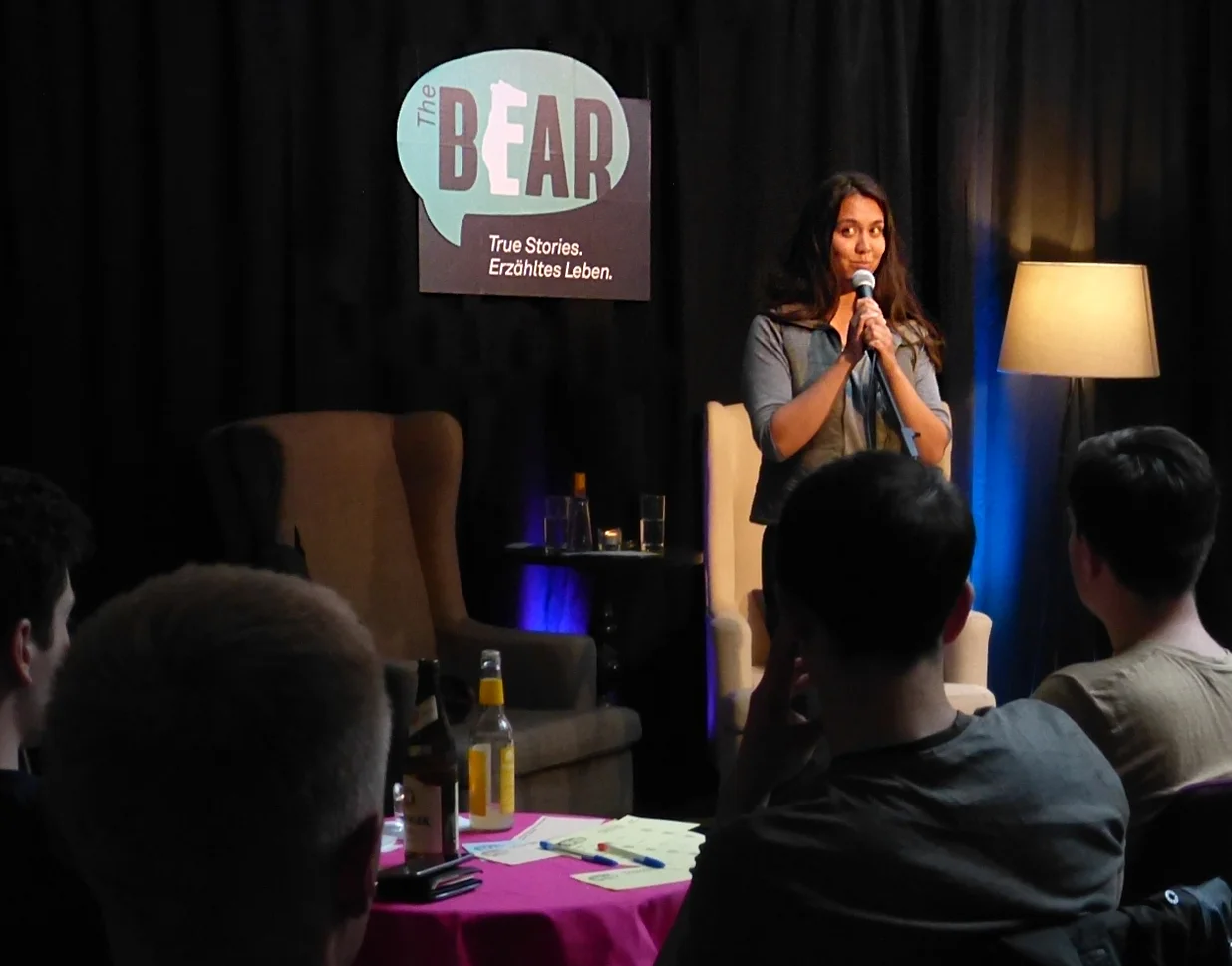 Once a month the stage is open to anyone who would like to tell a true story based on the evening’s theme. The story has to be your story (not your sister’s) and told live (without notes). Stories are 5 minutes and can be told in German or English.